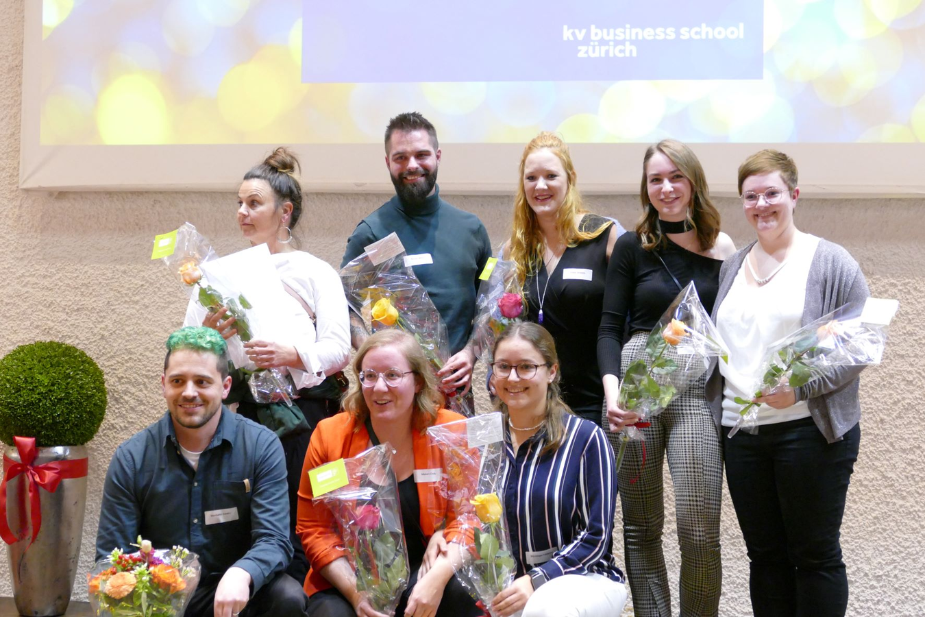 Sie liess die Prüfungen nochmals Revue passieren. Da hatten sicher einige die Erinnerung an diese Tage vor Augen. Die eidgenössischen Prüfungen sind nicht ganz einfach, auch für die, die während der Ausbildung immer vor Augen hatten DRANBLEIBEN, DRANBLEIBEN, DRANBLEIBEN. Für die, die an diesem Abend an der Abschlussfeier vor Ort waren, ist es gut ausgegangen. Die 5 besten Abschlüsse haben wir mit einem Blumenstrauss und einem Goldregen gefeiert. Ein tolles Ergebnis – herzlichen Glückwunsch!